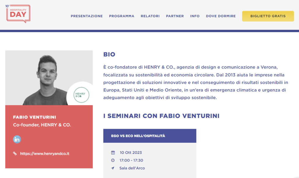 Fabio Venturini, co-founder e eco-designer di HENRY & CO. – Sustainable creativity & CO., sarà presente in veste di relatore all’Hospitality Day di Rimini il 10 di ottobre organizzato da Teamwork Hospitality.