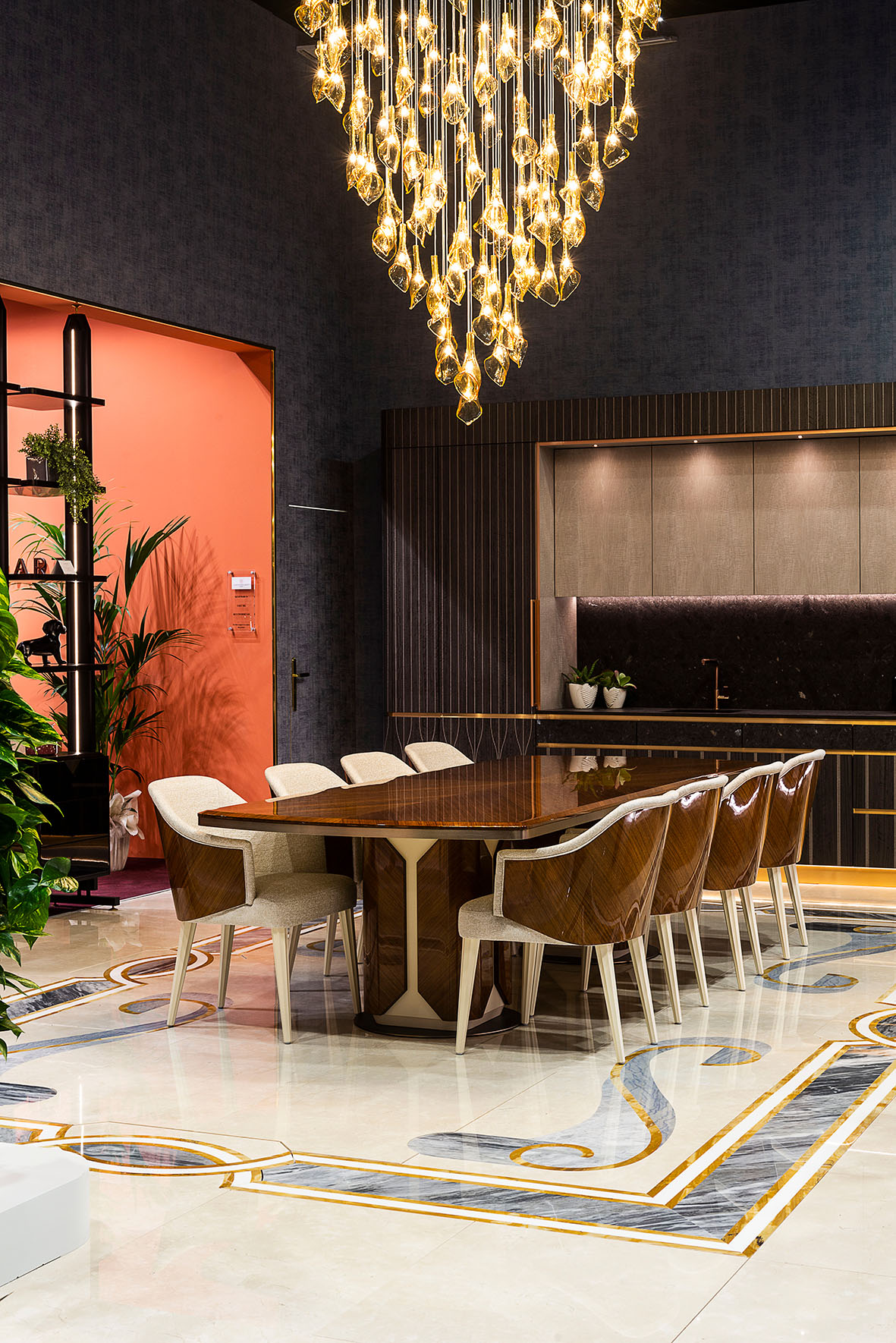In sinergia alle logiche di collaborazione e riutilizzo, i pavimenti in marmo sono stati realizzati in da Takt Sensitive Marble, azienda italiana specializzata nella lavorazione e trasformazione del marmo in opere esclusive, mentre l’illuminazione è stata fornita da Multiforme lighting, fornace storica di vetro di Murano specializzata nella realizzazione di opere di illuminazione di lusso.